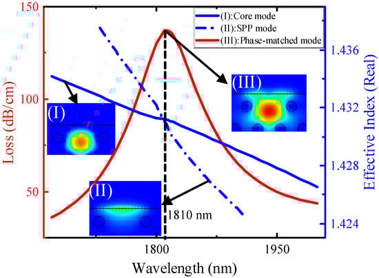 Light propagation in optical fibers can be solved by the fluctuation equation, and the longitudinal and transverse field solutions in optical fibers are different, so this requires a mode analysis of the fiber. Figure 3 shows the mode analysis and dispersion relationship of the sensor. The RI of the analyte is 1.34 for the sensor, and all parameters are the same as the model in Figure 1. When most of the light propagates in the center of the fiber, the polished detection plane has no light intensity, and this mode is called the core mode. Conversely, when there is almost no light in the core and most of the energy is gathered in the detection plane, this mode is called surface plasmon polaritons (SPPs) mode. The real part of the effective refraction of the two modes varies with the wavelength of the incident light. When the incident light is a certain value, the two modes will be phase matched to produce a strong coupling, and the real part of the two modes, which was originally monotonically decreasing, produces a small kink near this wavelength. At the same time, a large amount of energy in the core flows to the detection plane. The wavelength that can produce these phenomena is called the resonance wavelength. I, II, and III in Figure 3 show the core mode, SPP mode, and phase-matched mode, respectively. Currently, the fiber core has more energy and the detection surface also has energy. Different analytes have different refractive indices, the wavelengths of the resonance are different, and the detection of analytes is achieved by analyzing different resonance wavelengths.