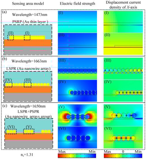 We analyzed the properties of PSPR, LSPR, and Au nanowire group array mechanically, and to better prove them, we simulated their electric fields and the carrier distribution in the X-axis direction by software simulation. As shown in Figure 4a, (I) and (II) are the middle part of the Au thin layer and one side of the endpoint; in the electric field diagram, it can be seen that the electric field in the middle part of the Au thin layer is more uniformly distributed, because the Au thin layer is longer, so the electric field at both ends is smaller. From the X-axis direction, the carrier concentration can be seen, as well as electrons in the metal Au thin layer uniform distribution. In Figure 4b, (III) and (IV), the middle part of the Au nanowire group and the endpoint are shown on one side. It can be seen from the electric field diagram that the electric field is stronger at the top and bottom of the middle part of the Au nanowire group, and a larger electric field also exists on the Au nanowire on its side. From the carrier concentration in the X-axis direction, there are more electrons at the connection of each Au nanowire. In Figure 4c, (V) and (VI) are the middle part of the Au nanowire group and the endpoint on one side. From the electric field diagram, there is a stronger electric field at the ends of the Au nanowire group and the contact region of the Au nanowires has a stronger electric field, as seen from the carrier concentration in the X-axis direction, where more electrons are gathered at the junction of each Au nanowire. Observing Figure 4b,c, we can find that there is a large electric field and displacement current density at the contact points of the adjacent Au nanowires. This is because, not only is there evanescent wave controlling the charge movement at the contact point, but also near the contact point, owing to the excessive high energy and very small distance, there may be a quantum tunneling effect between the two Au nanowires, which in turn increases the charge flow between the Au nanowires [,].