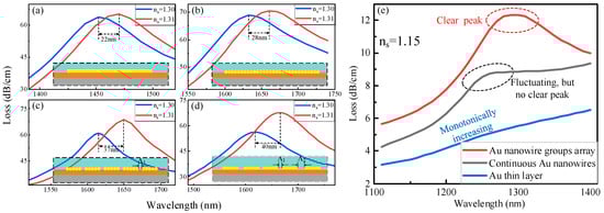 Loss analysis for different sensing regions at analytes 1.30 and 1.31. (a) Au thin layer; (b) Au nanowires; (c) Au nanowire groups array with spacing; (d) Au nanowire group array with and spacing. Detection range analysis (e) Au thin layer, continuous Au nanowires, and Au nanowire group array.