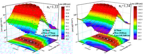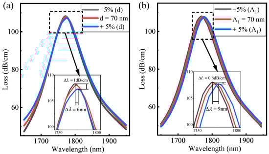 The analysis of manufacturing tolerances allows a good analysis of the errors caused by manufacturing process differences on the structure, which can reflect the stability and feasibility of the device. General manufacturing tolerances are considered in the range of ±2% to ±10% [,]. As shown in Figure 8, we analyze the ±5% manufacturing tolerance of the proposed sensor. Figure 8a shows the analysis of the Au nanowire diameter; when d varies around 70 nm, the resonance wavelength changes by 6 nm, and the resonance loss changes by 1 dB/cm. Figure 8b shows the analysis of the Au nanowire group spacing; when Ʌ1 varies around 70 nm, the resonance wavelength changes by 9 nm, and the resonance loss changes by 0.6 dB/cm. Compared with itself, these changes are basically negligible. In conclusion, our designed sensor can effectively reduce the appropriate interference owing to the manufacturing process.