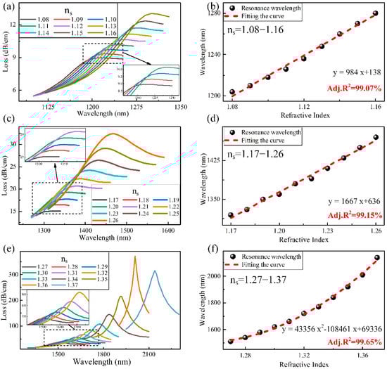 After optimizing the structural parameters of the sensor, we analyzed the performance of the sensor. The RI detection range of our designed sensor can reach 1.08 to 1.37. To describe the wide range of detection performance more accurately, we divided the detection bands into three: 1.08 to 1.16, 1.17 to 1.26, and 1.27 to 1.37, respectively. As shown in Figure 7, the resonance peaks as well as the shifts can be observed in the RI range from 1.08 to 1.16, although the loss curves vary less for different refractive indices, and in this range, the maximum (max) WS is 2000 nm/RIU, the average (ave) WS 1333 nm/RIU, and the fitted curve for the resonance wavelength is , with an adjusted R2 of 99.07%. When the RI range is 1.17 to 1.26, the max WS is 4000 nm/RIU, the ave WS is 2000 nm/RIU, and the fitting curve of resonance wavelength is , while the adjusted R2 is 99.15%. When the RI range is 1.27 to 1.37, the max WS is 13,000 nm/RIU, the ave WS is 6300 nm/RIU, the fitted curve of resonance wavelength is , and the adjusted R2 is 99.65%. Detailed data are shown in Table 1.