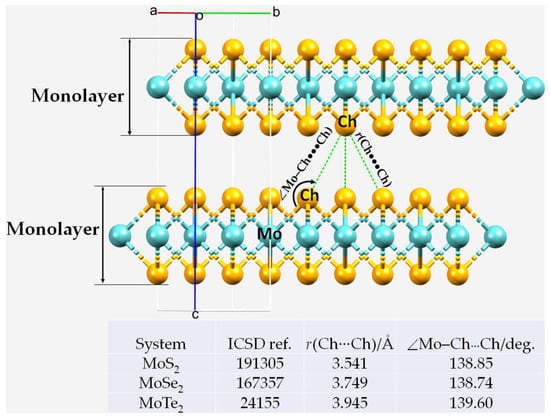 In order to understand whether there is a gap between the monolayers in the MoCh2 crystals, we examined the extent of overlapping between the Ch atoms responsible for the geometries of the dimers that resemble the interfacial geometry of the crystalline phase. To this end, we calculated the mutual penetration distance between the Ch···Ch atom-atom pair within the QTAIM framework. This, by definition, should be the difference between the intermolecular distance and twice the van der Waals radius of the Ch atom; the larger the mutual penetration distance, the stronger would be the strength of the interaction. For this, we calculated the non-bonded radius of each Ch atom in the Ch···Ch pair, responsible for the (MoCh2)2 (Ch = S, Se, Te) dimers shown in Figure 3. We considered these three systems since MoCh2 (Ch = S, Se, Te) have been intensely studied in the crystalline phase. Regardless of whether it is in the solid state, or in the gas phase, the non-bonded radius of an atom in molecules within the framework of the QTAIM was the shortest distance between its nucleus and the 0.001 a.u. isodensity envelope [113,145]. Our B2PLYPD3 calculation produced values of 2.133, 2.235 and 2.409 Å for the non-bonded radii of S, Se and Te in the (MoCh2)2 dimers, respectively. Twice these values are 4.266, 4.470 and 4.818, respectively; these are about 0.779, 0.920, and 1.086 Å larger than the Ch···Ch bond distances of 3.487, 3.550, and 3.732 Å for (MoS2)2, (MoSe2)2, and (MoTe2)2, respectively. This suggests that there is no gap between the two Ch layers of two consecutive monolayers of the bilayer MoCh2 systems.