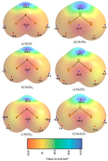 MP2(Full)/Sapporo-TZP-Diffuse computed electrostatic potential surfaces of the six MoCh2 and MoChCh′2 (Ch, Ch′ = S, Se, Te) monomers. The 0.0015 a.u. isodensity envelope was used, on which the electrostatic potential was computed. The tiny red and blue circles represent the VS,max and VS,min, respectively.