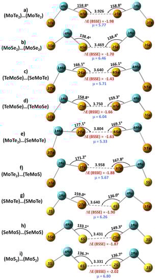 MP2(Full)/def2-TZVPPD computed energy-minimized geometries of (MoCh2)2 (Ch = Se, Te) and (MoChCh′)2 (Ch, Ch′ = S, Se, Te) dimers. Intermolecular bond distances, r(Ch···Ch), and bond angles, ∠Mo–Ch···Ch, are in Å and degrees, respectively. The basis set superposition error corrected binding energies (ΔE(BSSE)/kcal mol−1) and overall dipole moments (μ/D) of the dimers are shown. Table S2 of the Supplementary Materials lists the relaxed redundant internal coordinates of all the nine dimers.