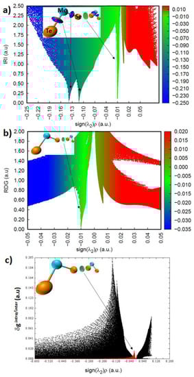 The reduced density gradient (RDG) noncovalent index (NCI) approach is similar, in some aspects, to the QTAIM approach, but it accounts for the reduced gradient of the charge density around the bond critical point region [70,83,84,85]. The NCI index is based on the normalized and dimensionless RDG s, which is given by , where ρ(r) is the charge density and ∇ρ is the gradient of the charge density. When the gradient of the charge density vanishes at any point r, s vanishes at that point [85,86]. This is what happens at the bond critical point within the framework of the QTAIM, where ∇ρ = 0 and hence s = 0. The RDG is capable of detecting interactions when the bond critical point centered topological feature is lacking in chemical systems (e.g., 1,n-alkanediols), a conclusion that was arrived at by Kjaergaard and coworkers [87]. Regions in space where (closed-shell) noncovalent interactions occur feature low values of ρ(r), ∇ρ and s, and regions of space where s and ρ have low and high values, respectively, and signify shared interactions (viz. covalent bonds). The isosurfaces of the RDG at low densities allow one to visualize the position and nature of covalent interactions in 3D space [87]. However, it is worth noting that the limitation of the RDG-NCI approach is that the isosurfaces in the inter- and intra-molecular bonding regions in large systems can be very noisy, causing some difficulty in identifying the actual sites that cause the interaction between them. To overcome this, several theoretical approaches similar to the RDG have been proposed more recently that allow one to overcome the noisy RDG isosurface features in large chemical systems. One of them is the real space function called the interaction region indicator (IRI) [67], which is a slight modification of the RDG, yet its results are comparable with the QTAIM’s topological analysis of charge density. The other function is the independent gradient model (IGM), proposed some time ago [68], that can be performed both on the computed wavefunctions and pro-molecular densities on specific regions of interest. These two computational approaches have an advantage over the RDG-NCI in that one can locally characterize an interaction between two atomic basins, ignoring other interactions that are not of focus of interest. We employed all these approaches to examine whether or not they provide similar insight into the nature of the intermolecular bonding interactions in the (MoCh2)2 and (MoChCh′)2 dimers. Post-processing codes, such as AIMAll [88], Multiwfn [89] and VMD 1.9.3 [90], and Gaussview 5.0 [91] software were used for the calculation, visualization, drawing and analysis of the electronic structure results obtained using Gaussian 16 [92].