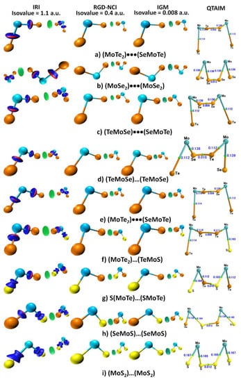The QTAIM-based molecular graphs, as well as the IRI, RDG and IGM-based NCI plots for all nine dimers are shown in Figure 5. Based on the conceptual framework of QTAIM, one might expect that the presence of an intermolecular interaction between two atomic entities in a molecular entity should be reflected as a bond critical point (bcp) in the bonding region with a small charge density, and that the Laplacian of the charge density (∇2ρb) should be positive. Indeed, a bcp was found between the intermolecularly bonded Ch atomic basins, with ρb close to 0.01 a.u. (Figure 5). We found ∇2ρb at the Ch…Ch bcps to be +0.021 a.u. (MoTe2···MoTe2, Figure 5a), +0.029 a.u. (MoSe2···MoSe2, Figure 5b), +0.024 a.u. (TeMoSe···SeMoTe, Figure 5c), +0.022 a.u. (TeMoSe···TeMoSe, Figure 5d), +0.021 a.u. (MoTe2···SeMoTe, Figure 5e) 0.018 a.u. (MoTe2···TeMoS, Figure 5f), +0.024 (SMoTe···SMoTe, Figure 5g), +0.030 a.u. (SeMoS···SeMoS, Figure 5h) and +0.033 a.u. (MoS2···MoS2, Figure 5i). The charge density and the Laplacian of the charge density values were small and positive, indicative of closed-shell interactions. The bcp topology was consistent with the IRI-, RDG- and IGM-based isosurface plots in which the bonding region between the chalcogen atoms in each dimer was accompanied by a single circular volume (isosurface), colored green/light-blue, in agreement with the sign(λ2) × ρ vs. IRI, sign(λ2) × ρ vs. RDG, and sign(λ2) × ρ vs. IGM-based δgintra/intra plots shown in Figure 4. We note that each approach had its own specific isovalue for the isosurface plot, and hence the color of these changes from greenish to light-blueish.