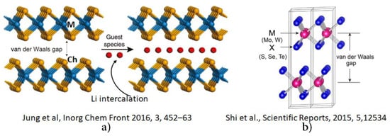 Examples showing the van der Waals gap in 2H-MCh2 layered crystals, as reported in two different studies. The figure on (a) is reproduced from [49], with permission from the Royal Society of Chemistry, which shows a van der Waals gap and Li intercalation between the two chalcogenide monolayers of 2H-MCh2. The figure on (b) illustrates the same van der Waals gap reported by Shi et al. (Sci. Rep. 2015, 5, 12534), yet persisting between the two metal layers of MCh2, in which, the sole importance of the two chalcogenide layers responsible for the so-called van der Waals gap shown in (a) was completely ignored.