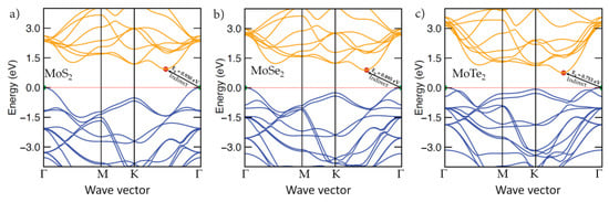 The SCAN-rVV10 computed band structures of bulk MoCh2(Ch = S, Se, Te) are shown in Figure 7. In all cases, an indirect bandgap transition between the valence band maximum (VBM) located at Γ and the conduction band minimum (CBM) located between K-Γ was found, a result which is in agreement with previous studies reported using DFT and higher-level calculations [32,151]. Although the SCF-level bandgap transition energies for MoCh2 were close to their corresponding experimental values, the non-SCF bandgaps were all underestimated (see Table 4). Despite this difference, the trend in the SCAN-rVV10-based bandgap energies across the three membered series is consistent with the experiment [34,35]. Our calculation suggests that both the Mo and S atoms contribute toward the formation of the VBM and CBM. In particular, it suggests that the 4d orbital of the Mo site contributes significantly both to the VBM and CBM, as does the np orbital of Ch (n = 3, 4 and 5 for S, Se and Te, respectively), although the 4d orbital contribution of Mo would be significant compared to that of the np orbital of S. For instance, the normalized contributions of the 4d(np) orbital of Mo(Ch) were 72.9 (20.9), 66.1 (27.9) and 58.5% (34.8%) for the VBM of MoS2, MoSe2 and MoTe2, respectively. The corresponding contributions for the CBM were 78.7% (18.7%), 77% (18.4%) and 75.6% (19.1%) for the three systems, respectively. That the 4p and np orbitals, respectively, of Mo and S collectively play a decisive role in determining the bandgap properties of MoCh2 systems is consistent with previous studies [107,152,153]. It is worth noting that the large contributions of Mo(4d) have emerged mainly from the 4dxy, 4dx2−y2 and 4dz2 orbitals, as has been noted by others [154] and that both the VBM and CBM show a significant metallic character.