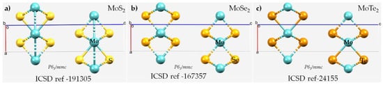 The unit-cells of (a) 2H-MoS2, (b) 2H-MoSe2 and (c) 2H-MoTe2. The Inorganic Crystal Structure Database reference codes (ICSD ref) and the space group are shown for each case. Table 1 summarizes the details of the lattice properties.
