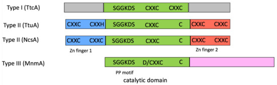 Biosynthetic pathways leading to sulfurated nucleosides were originally classified into two types, depending on the involvement or not of Fe–S-dependent proteins [35]. Among the Fe–S-dependent enzymes, the TtcA/TtuA protein family was shown to be characterized by the existence of both a PP-loop and a central Cys-X-X-Cys (CXXC) motif in the protein sequence [36] (Figure 1). The family was further divided into two distinct groups, based on the presence and location of additional CXXC motifs. TtcA, which catalyzes C32–tRNA sulfuration in bacteria and some archaea, is representative of subtype I, with two central CXXC motifs [36]. TtuA, which catalyzes U54–tRNA sulfuration in archaea and thermophilic bacteria, is representative of subtype II, with only one central CXXC motif and zinc finger sites (each composed of two CXXC/H motifs) at the N- and C-terminal ends [37]. Enzymes, which catalyze U34–tRNA sulfuration in archaea (named NcsA) and the cytosol of eukaryotes (named Ncs6, Ctu1), belong to subtype II [37,38]. In contrast, enzymes, which synthesize s2U34–tRNA in bacteria, named MnmA, represent a different class that possesses a PP-loop motif and only one central D/CXXC motif [39]. TtuA [28,29], TtcA [36,40], NcsA/Ctu1 (Bimai et al., in preparation, PDB code 6SCY), as well as MnmA from Thermus thermophilus and Escherichia coli [30,31], were shown to use the central CXXC + C motif to bind a [4Fe-4S] cluster. In all of these enzymes, the PP motif (Figure 1) is used to bind ATP to activate the target base.