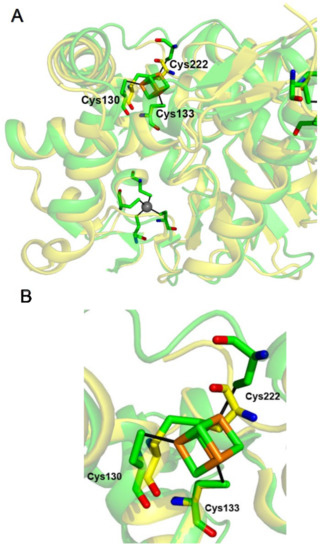 Comparison of the crystal structures of apo- (PDB code 3VRH, in yellow) and holo-TtTtuA (PDB code 5B4F, in green). The cysteines of the CXXC + C motif, which coordinate the cluster, are shown in stick representation and labeled. The iron and sulfur atoms of the cluster are shown in orange and green, respectively. (A) General view with the zinc ions (grey spheres) and the cysteine/histidine coordinating residues, from the additional CXXC/H motifs, shown in stick representation. (B) Comparison of the [4Fe-4S] binding sites of the apo- and holo-TtTtuA structures. In the apo-structure, Cys130 and Cys222 are linked by an intramolecular disulfide bond (2.1 Å) and the sulfur atom of Cys133 is located 5.9 and 4.5 Å away from Cys130 and Cys222, respectively.