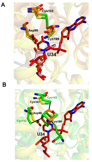 The structure of MnmA from E. coli (EcMnmA) in complex with tRNA was solved in three states: the initial binding state, the prereaction state, and, after reaction with ATP, the adenylated state [41]. Like TtuA, the structures of EcMnmA in the first two states showed that two cysteines that are necessary for activity were involved in an intramolecular disulfide bond (Figure 3A, initial binding state in orange).
