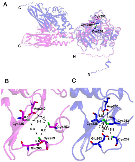 Given the important role of the four cysteines of the two CXXC motifs for the in vivo function of PaTtcA and the fact that mutation of one of the four conserved cysteines of EcTtcA, Cys210, led to only a 50% decrease in catalytic activity, the question is raised whether all four cysteines, or only three, coordinate the cluster. Unexpectedly, Metalpredator did not succeed in proposing potential amino acids as candidates for forming the Fe–S-binding site. In the absence of a structure of a TtcA enzyme, we used AlphaFold and RoseTTAFold modeling to understand whether the cluster-binding site is pre-formed in apo-EcTtcA. Moreover, to examine the variability of the positions of the sulfur atoms of the four central cysteines of TtcA proteins and investigate their potential involvement in cluster binding, we superposed the two EcTtcA models with the AlphaFold models of PaTtcA [42] and Giarda lamblia TtcA (GlTtcA) [36,42], for which the C32–tRNA sulfuration activity has not been experimentally validated (Figure 4).