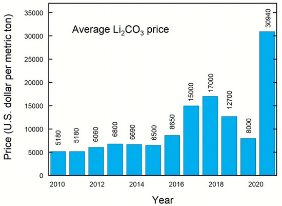 Evolution of the price of lithium per metric ton of lithium carbonate equivalent units (years 2010–2021).