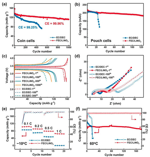 Electrochemical performance of Li||LiFePO4 coin or pouch cells with either the EC/DEC or FEC/LiNO3 electrolyte. (a) The cycle life and Coulombic efficiency (CE) of Li||LiFePO4 coin cells at 1C after one cycle at 0.1C. (b) Cycling performance of Li||LiFePO4 pouch cells with a theoretical capacity of 0.25 Ah at 0.2C after one cycle at 0.05C. 50 μm thick lithium foils were used as anodes. (c) Voltage–capacity curves of Li||LiFePO4 coin cells. (d) Electrochemical impedance spectroscopy (EIS) of Li||LiFePO4 coin cells. (e) Rate capacity and CE of Li||LiFePO4 coin cells at −10 °C, at 1.0C. (f) High-temperature performance of Li||LiFePO4 coin cells at 60 °C and corresponding CE at 1C. Reproduced from [18].