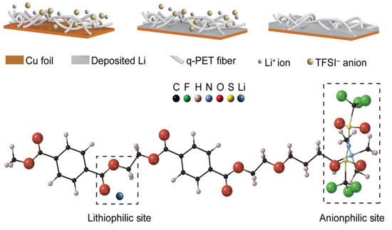 (Top) Lithium deposition on q-PET interlayer/Cu. q-PET can attract large quantities of Li ions and TFSI− anions from its polar functional groups. Uniform ion distribution at the anode surface promotes smooth deposition. The sketch of the structure of q-PET shows that dendrite-free Li deposition is facilitated via rationally engineered binding toward both Li cation and TFSI− anion. (Bottom) Cycling performance of Li||LiFePO4 half-cell at 0.5C with bare Li (black) or q-PET/Li electrode (red), and cycling performance of Li||Li4Ti5O12 half-cell at 2C with or without q-PET. Reproduced from [32].