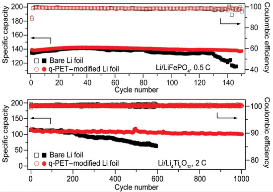 Anions also play an active role in solvent oxidation [24,25]. The anion reduction of the salt is the most important factor in passivating the bare Li anode [26,27]. Lithium bis(fluorosulfonide)imide (LiFSI) is a most attractive salt as FSI− anion forms a robust SEI protecting layer on the Li surface [28], in particular in DOL/DME solvents [29,30,31]. Zhang et al. obtained a synergistic regulation of cations and anions at the SEI by formation of a quaternized polyethylene terephthalate (q-PET) interlayer with a “lithiophilic” ester building block and an “anionphilic” quaternary ammonium functional block. The lithiophilic character comes from the polar ester functional groups in the backbone of the PET, and the quaternary ammonium functional group tethered on the PET molecular skeleton can bind and immobilize a certain number of tri(bis(trifluoromethane)sulfonimide) (TFSI−) anions. The q-PET–modified symmetric cells showed stable cycling over 1000 cycles (up to 650 h) at 3 mA cm−2 and a CE of 96% for an areal capacity of 1 mAh cm−2 [32]. These results were obtained with 1 mol L−1 LiTFSI in DOL/DME (1:1 by volume) with 2 wt.% LiNO3 as the additive (see Figure 6).