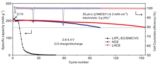 Cycling performances of Li||NMC811 cells in different electrolytes with a 50 μm Li anode, 4.2 mAh cm−2 NMC811 cathode, and lean electrolyte at 14 μL. The highly concentrated electrolyte (HCE) is LiFSI in 1,2-dimethoxyethane at a molar ratio of 1:1.2. The localized highly concentrated electrolyte (LHCE) is formed by adding 1,1,2,2-tetrafluoroethyl-2,2,3,3-tetrafluoropropyl ether (TTE) as the diluent into the HCE to yield LiFSI-1.2DME-3TTE (in molar ratio). Reproduced from [53].