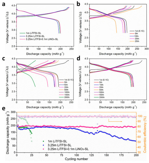 (a) Initial charge/discharge curves of Li||NMC811 cells in different electrolytes at 0.1C with sulfolane (SL) solvent. Charge/discharge curves of Li||NMC811 cells during different cycles using (b) 1 mol L−1 LiTFSI-SL, (c) 3.25 mol L−1 LiTFSI-SL, and (d) 3.25 mol L−1 LiTFSI-0.1 mol L−1 LiNO3 SL electrolytes at 0.5C except for the first cycle at 0.1C. (e) Discharge capacity and CE of Li||NMC811 cells cycled in different electrolytes between 2.8 to 4.4 V at 0.1C rate for two cycles, followed by 0.5C (1C = 200 mAh g−1). Reproduced from [76].
