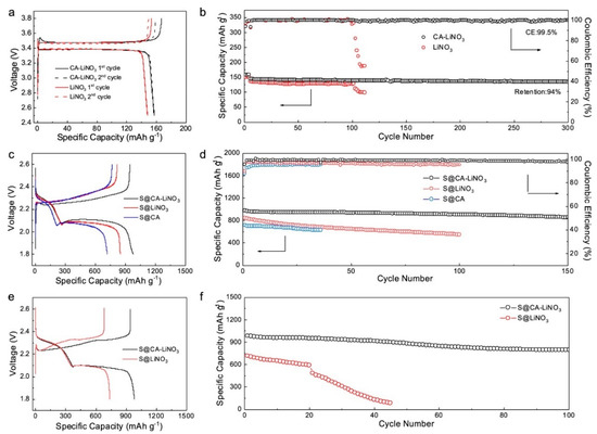 Recently, Luo et al. proposed another strategy using additives containing catechol and acrylic groups to construct a SEI by in situ anionic polymerization, leading to the formation of isotropic Li nanospheres avoiding the formation of dendrites [80]. With this process, the anode was able to cycle at current density up to 10 mA cm−2, demonstrating a cycle life over 8500 h operation and high cumulative capacity over 4.25 Ah cm−2. The electrochemical properties of full cells are reported in Figure 9, when caffeine acid (CA) is selected as the representative additive. Importantly, the figure illustrates that the performance of this anode is remarkable not only for Li||LiFePO4 but also for Li||S batteries because the CA additive facilitates the dissociation of short chain polysulfides Li2S/Li2S2, which reduces the formation of insoluble Li2S particles.