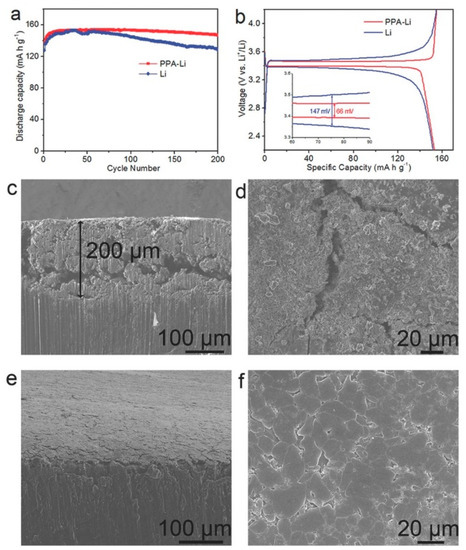 Cycling performance of the Li|LiFePO4 battery system using Li metal and polyphosphoric acid (PPA)-Li anodes. (a) The typical charge/discharge profiles after activation at a current rate of 0.5C. The inset of (b) shows enlarged profiles. (c) Side-view SEM image and (d) top-view SEM image of the Li metal anode after 200 cycles. (e) Side-view SEM image and (f) top-view SEM image of the PPA-Li anode after 200 cycles. Reproduced from [114].