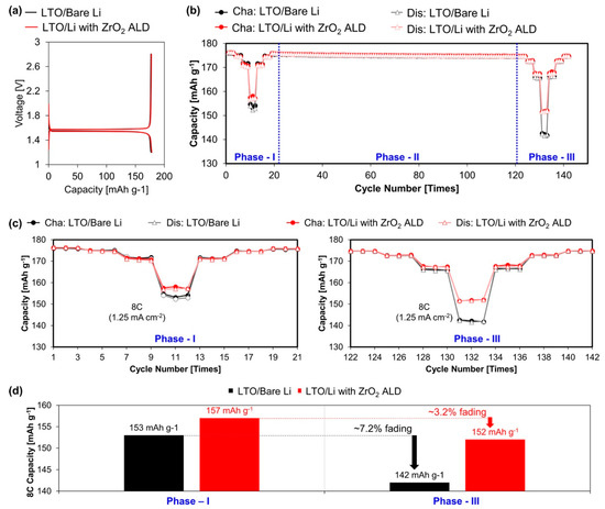 (a) Formation cycle for the bare-Li and Li with ZrO2 ALD coin cells at a 0.1C rate (0.01 mA cm−2 current density) in the potential window 1.2–2.8 V performed at 23 °C temperature. (b) Electrochemical cycling of the bare-Li and Li with ZrO2 ALD coin cells at different charge–discharge current rates in the potential window 1.2–2.8 V performed at 45 °C high temperature. (c) Electrochemical rate performance comparison of the bare-Li and Li with ZrO2 ALD coin cells. (d) Bar graph comparing the 8C (1.25 mA cm−2) rate capacity and recovery of the samples during the phase I and phase III cycling performed in the potential window 1.2–2.8 V at 45 °C high temperature. The three phases are as follows: phase I = cycling at 1C, 2C, 4C, and 8C and back to 1C in the same steps for 3 cycles each; phase II = 1C rate for 100 cycles aging; and phase III = cycling at 1C, 2C, 4C, and 8C and back to 1C in same steps for 3 cycles each, where 1C is equivalent to 0.16 mA cm−2 current density. Reproduced from [124].
