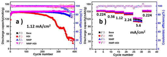 (a) Cyclic and (b) rate performances of Li/LiFePO4 cells in different electrolytes where hexamethylene diisocyanate (HDI) and 1-methyl-2-pyrrolidone (NMP) are utilized as an additive combination to study the effects of amide-derived interfacial filming on the lithium metal. Reproduced from [159].