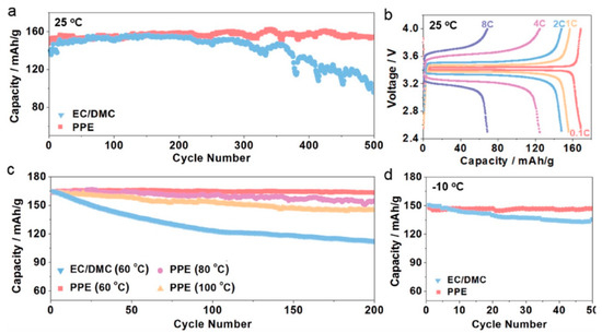 (a) Cycling performance of LiFePO4/Li cells using PPE and LiPF6-EC/DMC electrolytes for 500 cycles at 25 °C by the rate of 0.5C, where PPE is a temperature-responsive electrolyte with two kinds of polymerization behavior for LMBs, consisting of poly(ethylene glycol) methyl ether methacrylate (PEGA) and 2,2,3,3,3-pentafluoropropyl acrylate (PFE). (b) Typical charge/discharge curves of LiFePO4/PPE/Li cells under the varied rate from 0.1C to 8C. (c) Cycling performance of LiFePO4||Li cells with PPE and LiPF6-EC/DMC electrolytes at elevated temperatures by 0.5C. (d) Cycling performance of LiFePO4||Li cells using PPE and LiPF6-EC/DMC electrolytes at −10 °C by the rate of 0.1C. Reproduced from [160].
