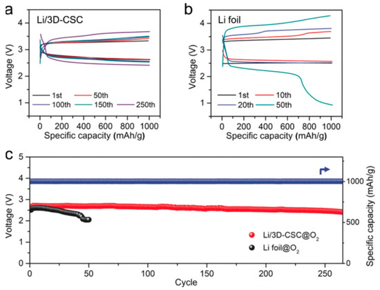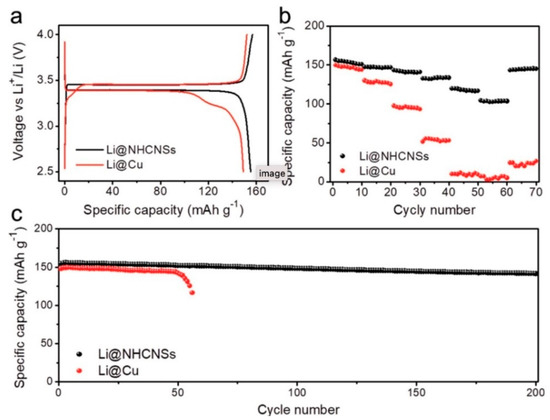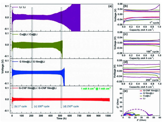 Nano-carbon skeleton has been proposed under the form of graphene matrix [180,181,182,183,184,185], carbon nanotubes (CNTs) [183,184,185,186,187,188,189], graphene–CNT hybrid [190], carbon nanofibers [191,192,193], spherical carbon granules [194], hollow carbon fibers [195], hollow carbon nanospheres [142,196,197], or porous carbon film [198]. Zhang et al. Infused molten lithium into a carbonized wood (C-wood) as a 3D, highly porous (73% porosity) conductive framework. In symmetric cells, the as-prepared Li/C-wood electrode presented a lower overpotential (90 mV at 3 mA cm−2), more-stable stripping/plating profiles, and better cycling performance (~150 h at 3 mA cm−2) compared with bare Li anode [177]. Yue et al. used 3D carbon skeleton derived from soybean oil [199]. Lang et al. obtained a surface graphited carbon scaffold by heating a common carbon matrix at 1200 °C [200].