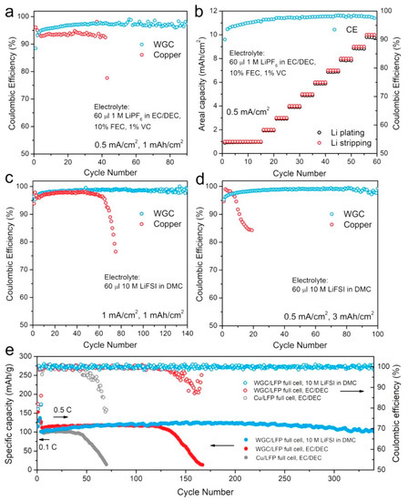- Shuai, Y.; Lin, H.; Chen, K.; Chen, S.; He, X.; Ge, K.; Li, N.; Gan, F. The effects of carbon-modified electrode on stability of lithium metal deposition with high areal capacity and high Coulombic efficiency. Mater. Lett. 2017, 209, 71–74. [Google Scholar] [CrossRef]