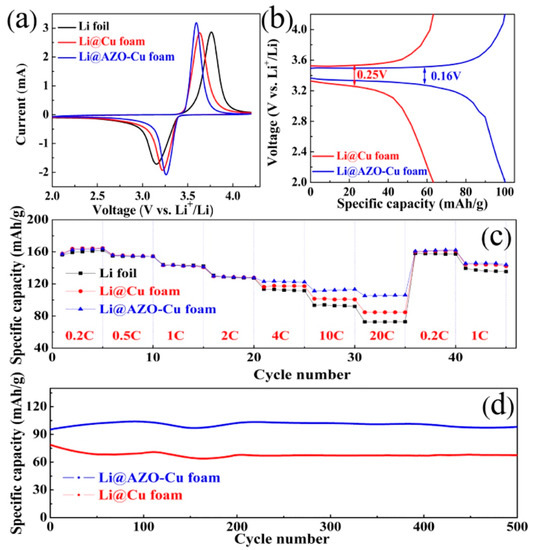 - Lu, S.; Wang, Z.; Yan, H.; Wang, R.; Lu, K.; Cheng, Y.; Qin, W.; Wu, X. High rate and cycling stable Li metal anodes enabled with aluminum-zinc oxides modified copper foam. J. Energy Chem. 2020, 41, 87–92. [Google Scholar] [CrossRef] [Green Version]