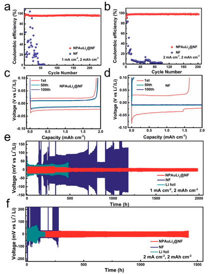 - Liang, Y.; Chen, Y.; Ke, X.; Zhang, Z.; Wu, W.; Lin, G.; Zhou, Z.; Shi, Z. Coupling of triporosity and strong Au-Li interaction to enable dendrite-free lithium plating/stripping for long-life lithium metal anodes. J. Mater. Chem. A 2020, 8, 18094–18105. [Google Scholar] [CrossRef]