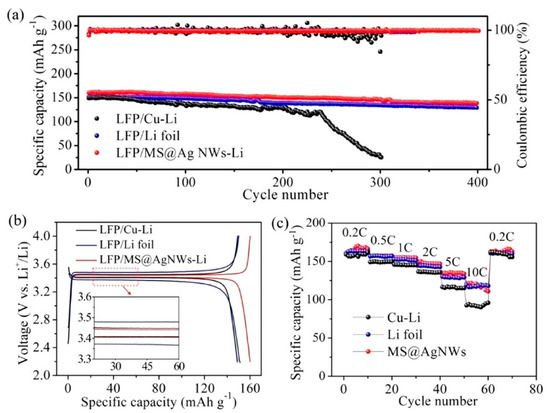 (a) Phosphate-based surface modification. Li3PO4 coating is an example. It is of interest for two reasons: first, it is a good ionic conductor. Second, its Young’s modulus of 10–11 Gpa is sufficiently high to prevent the formation of dendrites. A uniform, 50 nm thick Li3PO4 film was obtained by liquid processing, namely, in situ reaction of polyphosphoric acid (PPA) with metallic Li. The Li||LiFePO4 cell with the artificial Li3PO4 SEI layer on the Li foil delivered a stable capacity of 150 mAh g−1 after 200 cycles at a current rate of 0.5C (see Figure 10) [114].