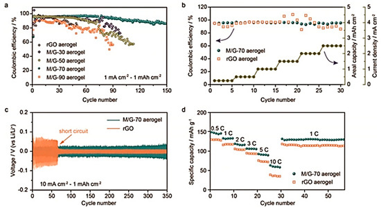 The leveling of the lithium can be monitored by deposition of the lithium on a lithiophilic matrix. Oxidized polyacylonitrile [172], poly(acrylonitrile) (PAN) fibers [173] glass fiber (GF) cloth with functional groups (Si-O, O-H, and O-B) was also used to guide the Li deposition [174]; fibrous metal felt [175] belongs to this family. ZnO can also be used to fabricate a lithiophilic matrix. Liu et al. used the reaction of molten Li with ZnO on the surface of polyimide matrix. Then, the uniformly dispersed zinc originated from ZnO reduction serves as seeds to guide Li deposition [176]. In a similar approach, Zhang et al. infused molten Li into a highly porous conductive carbonized wood, forming a lithiophilic matrix. As a result, this anode demonstrated a smaller overpotential (90 mV at 3 mA cm−2) and better performance (150 h at 3 mAh cm−2) [177]. Graphene possesses lithiophilic sites for Li deposition owing to N-containing functional groups, such as pyridinic and pyrrolic nitrogen [178], or simply N-doping [179]. Materials that are not lithiophilic can also be used as skeletons, but after functionalization, as shown hereunder.