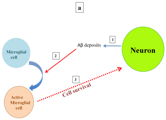 Microglia are brain-specific macrophages known as the first line of defense in the central nervous system [100]. Increased microglia activation has been reported in dementia. Related data indicate that this is associated with white matter maintenance and preserved cognition in dementia with Lewy bodies; however, it is not associated with reduced grey matter volume [101]. While a study indicated that microglial activation is negatively correlated with hippocampal volume in patients with Parkinson’s disease dementia [102], another study reported that microglial activation is associated with white matter maintenance as well as preserved cognition in Parkinson’s disease dementia [103]. In a case with AD, microglia markers were repeatedly reported as being overexpressed in the brains of patients. Among the different regions of the brain, the white matter and cerebellum appear to be more resistant to this increase [104]. New findings suggest that microglial activation in MCI patients is correlated with greater grey matter and hippocampal volumes [105], whereas previously reported data indicated that microglia activation is inversely associated with the hippocampal volume in patients with AD [102]. In fact, microglia play a dual role in AD, either inducing nerve survival (by clearing Aβ deposits) or disturbing the neuronal function and then leading to cell death (by releasing cytotoxic mediators). The magnitude and context of microglial activation lead different molecules to be secreted with different effects [94,106,107] (Figure 1).