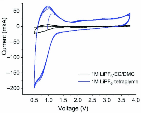 The conductivity of a 1 M LiPF6 EC/DMC (1:1) electrolyte is 10 mS cm−1 at 20 °C. The electrolyte based on 1 M LiPF6 in tetraglyme has a conductivity of about 2.4 mS cm−1 at room temperature, a viscosity of 14.65 MPa s [28,29], and a wide window of electrochemical stability (4.8 V vs. Li+/Li) [30].