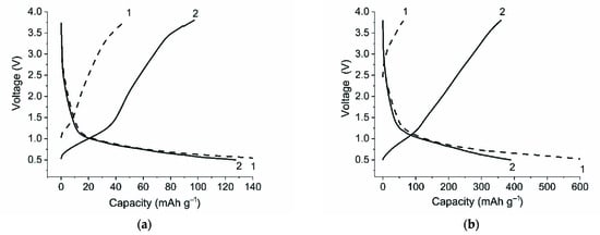 Figure 2 shows the PTTA characteristic peak in a range of 0.5–1.25 V vs. Li+/Li. This is probably due to the participation of carbon in the redox process, but its function as an electron carrier is more important. If we exclude the cycling range in a range of 0.5–1.25 V, then high organic material capacity values cannot be achieved, and the contribution of the carbon capacity to the total capacity of the electrode material does not exceed 15–20%.