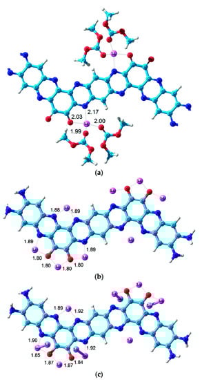 Calculated structures of complex PTTA4[Li+(DMC)2] (end fragments are omitted) (a) and products of reductive metalation of PTTA2 oligomer with 8 Li atoms (b) and with 12 Li atoms (c). Bond lengths are given in Å.