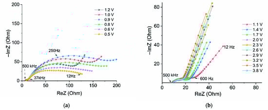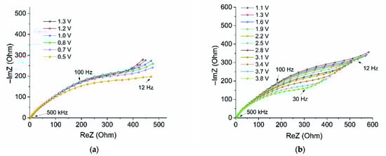 Figure 6 shows the impedance hodographs of the processes of lithiation (Figure 6a) and delithiation (Figure 6b) of the Li//PTTA cells with the carbonate electrolyte. Figure 6 shows that the impedance resistance values of the lithiation and delithiation processes are practically identical. Apparently, both processes proceed with a high and comparable resistance at the electrode/electrolyte interface due to the involvement of the solvate shell (Figure 4a).