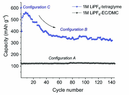 It can be seen from Figure 7 that for the cell with 1 M LiPF6 in tetraglyme, the discharge capacity is the highest (it reaches a theoretical capacity of 546 mAh g−1 for the 6-electron redox transition). At the same time, a decrease in the discharge capacity is observed from cycle to cycle, while for the EC/DMC, cell the discharge capacity is 125 mAh g−1 and remains stable for 140 charge-discharge cycles.
