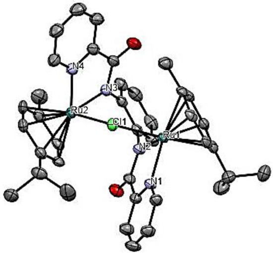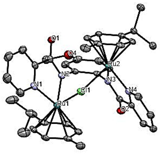 The slow diffusion of diethyl ether into dichloromethane solutions of complexes Ru1 and Ru4 gave single crystals suitable for X-ray analyses. Figure 1 and Figure 2 show the molecular structure of the cationic complexes Ru1 and Ru4, respectively, while the crystallographic data are shown in Table 1. The packing diagrams and structures of the compouds showing the counter anions and solvent molecules are given in Figures S35–S38. Complexes Ru1 and Ru4 crystallise in triclinic and monoclinic systems with P-1 and P21/c, space groups, respectively. The net charge on the cationic species in Ru1 and Ru4 are balanced by the counter-anions [Ru(η6-p-cymene)Cl3]− and [PF6]−, respectively. The half-sandwich complexes Ru1 and Ru4 exhibit three-legged piano stool geometry (Figure 1 and Figure 2), which is typical of [Ru(η6-p-cymene)(L)Cl]+ complexes. In the coordination sphere of both compounds, Ru1 and Ru4, the p-cymene ring resides on the apex, whereas the bridging chlorido ligands, Npyridine ^ and Namidate chelate, constitute the base of the piano stool. In the two complexes (Ru1 and Ru4), the five-membered chelating rings have an average bite angle for Npyridine -Ru- Namidate of 77.18 (18)° Å. The two Ru(II) atom centres in both compounds are separated by an average distance of 4.167 (5) Å, which is relatively shorter than the average 5.613 ± 18 Å calculated for 9 half-sandwich dinuclear ruthenium(II) complexes [27]. The average bond distance for Ru-Npyridine and Ru-Namidate of 2.093 (2) Å and 2.109 (2) Å in compounds Ru1 and Ru4 are within the mean bond length for Ru-Npyridine = 2.090 (14) Å and Ru-Namidate of 2.083 (22) Å, obtained from three (3) piano-stool Ru(II) complexes [27]. The p-cymene rings in the compounds are almost planar, with the Ru(II) atoms at 3.205(11) Å distance from the centroid of the p-cymene rings, and are comparable to the average 3.182(18) Å calculated for 18 half-sandwich Ru(II) structures [27].
