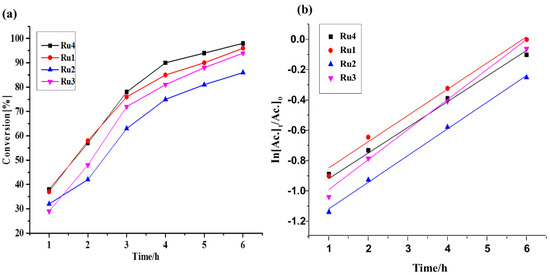 Time-dependent transfer hydrogenation reaction of acetophenone catalysed by Ru1–Ru4, 5.00 × 10−3 mol% (50 ppm); tBuOK: 4.0 mol%; temp. 82 °C). (a) Yield (%) vs. time graph, (b) −In[Ac.]t/[Ac.]0 vs. time plot of the Ru1–Ru4 catalysts (Ac.—acetophenone).