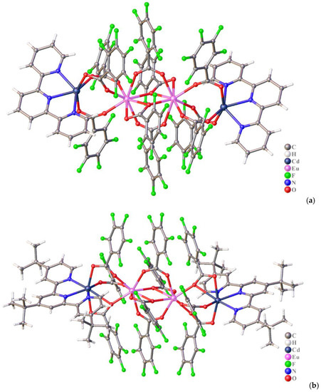 - Shmelev, M.A.; Gogoleva, N.V.; Kuznetsova, G.N.; Kiskin, M.A.; Voronina, Y.K.; Yakushev, I.A.; Ivanova, T.M.; Nelyubina, Y.V.; Sidorov, A.A.; Eremenko, I.L. Cd(II) and Cd(II)–Eu(III) Complexes with Pentafluorobenzoic Acid Anions and N-Donor Ligands: Synthesis and Structures. Russ. J. Coord. Chem. 2020, 46, 557–572. [Google Scholar] [CrossRef]