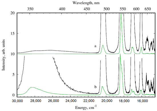Luminescence spectra of 2Tb (a) and 3Tb (b) at λex = 280 nm and T = 300 K in solid state. The black curves show the spectra after magnification.