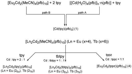 All synthetic work was performed in air. Commercially available reagents were used as received, 2,2′:6′,2″-terpyridine (tpy, 98%, Sigma-Aldrich Chemie, Steinheim, Germany), 4,4′,4″-tri-tert-butyl-2,2′:6′,2″-terpyridine (tbtpy, 95%, Sigma-Aldrich Chemie, Steinheim, Germany), 2,3,5,6-tetra-(pyridin-2-yl)pyrazine (tppz, 97%, Sigma-Aldrich Chemie, Steinheim, Germany), EtOH (96%, Ferein, Elektrogorsk, Moscow region, Russia), MeCN (≥99.5%, “Chimmed, Moscow, Russia”). The initial substances [Eu2Cd2(MeCN)4(pfb)10], [Tb2Cd2(MeCN)6(pfb)10]·4MeCN and [{Cd(H2O)4(pfb)}n·n(pfb)] were synthesized according to the literature method [26,28].