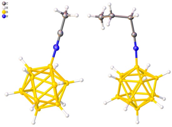 Derivatives of closo-borate anions with exo-polyhedral B-N bonds are the most interesting, and most often studied, boron cluster compounds [,,]. Initially, most interest was focused on ammonium derivatives of closo-borate systems [BnHn−1NH3]− []. These compounds can be easily modified by substituting the hydrogen atom of the NH3-group. Various borylated alkylamines [,], amides [,], imines [] and amidines [] can be prepared by such methods.