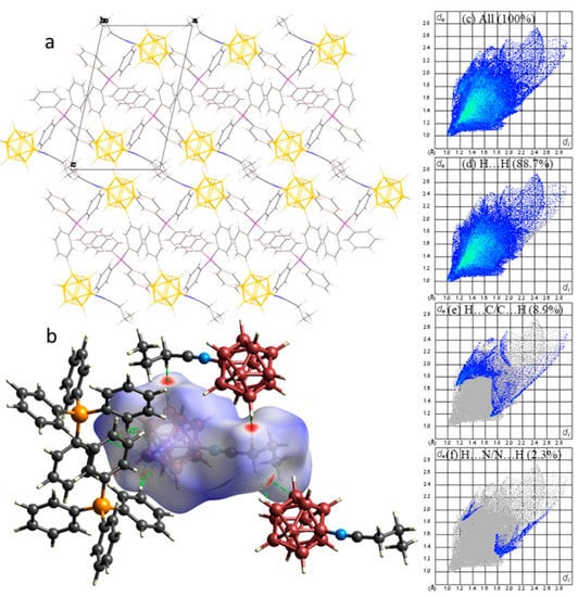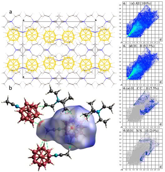 (a) Packing diagram, (b) dnorm surface of ((C2H5)4N)[B12H11NCCH3]− anion, (c) full two-dimensional fingerprint plot for 1a, together with that delineated into (d) H…H, (e) H…C/C…H, and (f) H…N/N…H contacts.