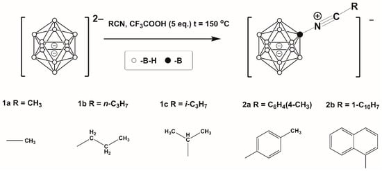 As previously stated, the main goal of the present research was to establish the best conditions for the preparation of derivatives with both aliphatic and aromatic substituents. The approach used was one that had been employed by the authors in previous research []. This process involved obtaining the target substances in a glass autoclave at an oil bath temperature above 150 °C. The CF3COOH was used as an electrophilic inducer (Scheme 1). As in the case of the acetonitrile derivative, the complete conversion of the initial salt of closo-dodecaborate anion with tetrabutylammonium cations ((n-C4H9)4N)+ occurred in about 30 min. Increasing the reaction time had a negative effect on the yield of the target nitrile derivative due to formation of additional by-products such as carboxylic derivatives of closo-dodecaborate anion.