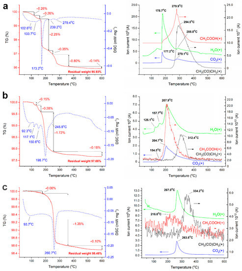 TGA/DSC/MS curves of ZnO@AcZn(5%) (a), ZnO@AcZnTVT(5%) (b), CSP ZnO@AcZnTVT(5%) (c).