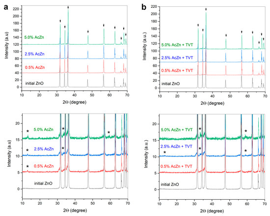 XRD patterns of initial ZnO powder, ZnO powders impregnated by 0.5–5.0 wt.% ZnAc (a), ZnO powders after impregnation by 0.5–5.0 wt.% ZnAc followed by TVT (b). Arrows indicate ZnO (COD #9008877), asterisk indicated traces of the LBZA (probably).
